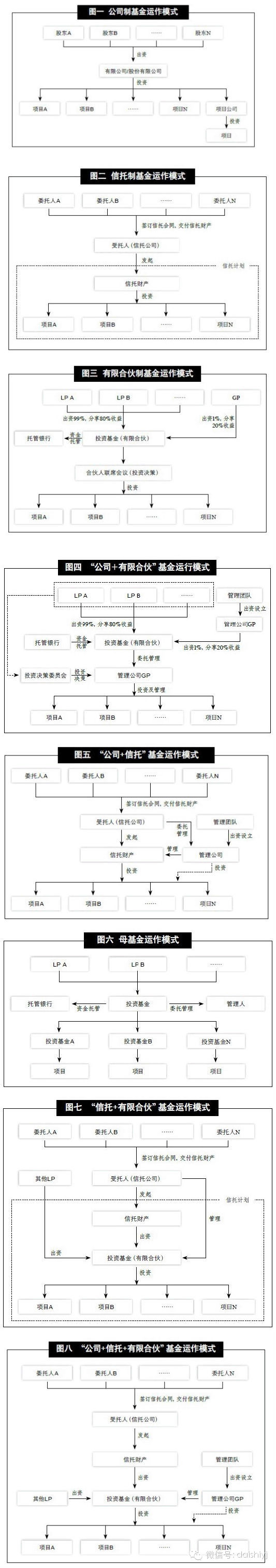 1.公司制;2.信托制;3.有限合伙;4.公司+有限合伙;5.公司+信托;6.FOF;7.信托+有限合伙;8.公司+信托+有限合伙。
